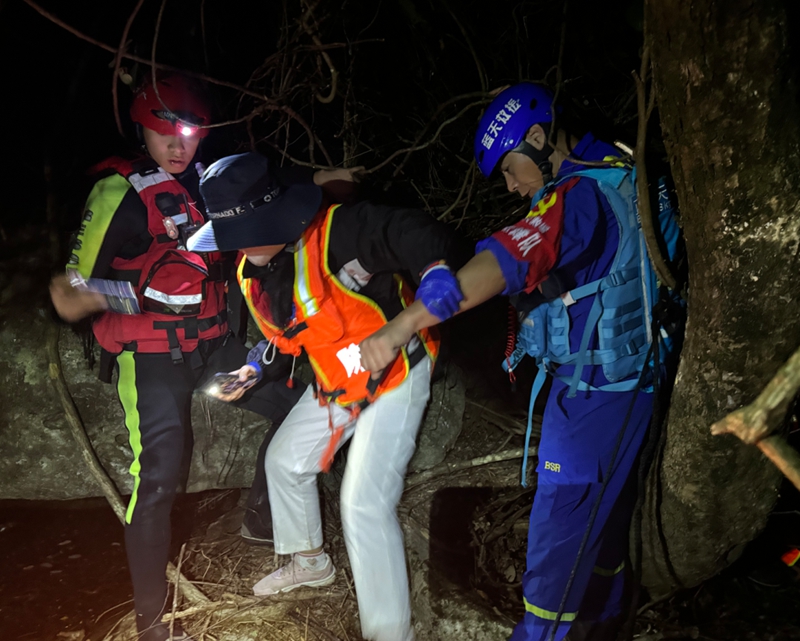 經(jīng)過一番搜尋,救援組確定被困人員的位置。消防員攜帶救援裝備與派出所、村民協(xié)同救助,為被困人員依次穿戴好救生衣,并使用村民沖鋒舟分批來回轉(zhuǎn)移。救援上來后,救援組及時為被困人員提供飲用水、餅干,同時第一時間通知他們的家屬。經(jīng)過近2個小時的緊急救援,17名被困“驢友”被成功帶下山。