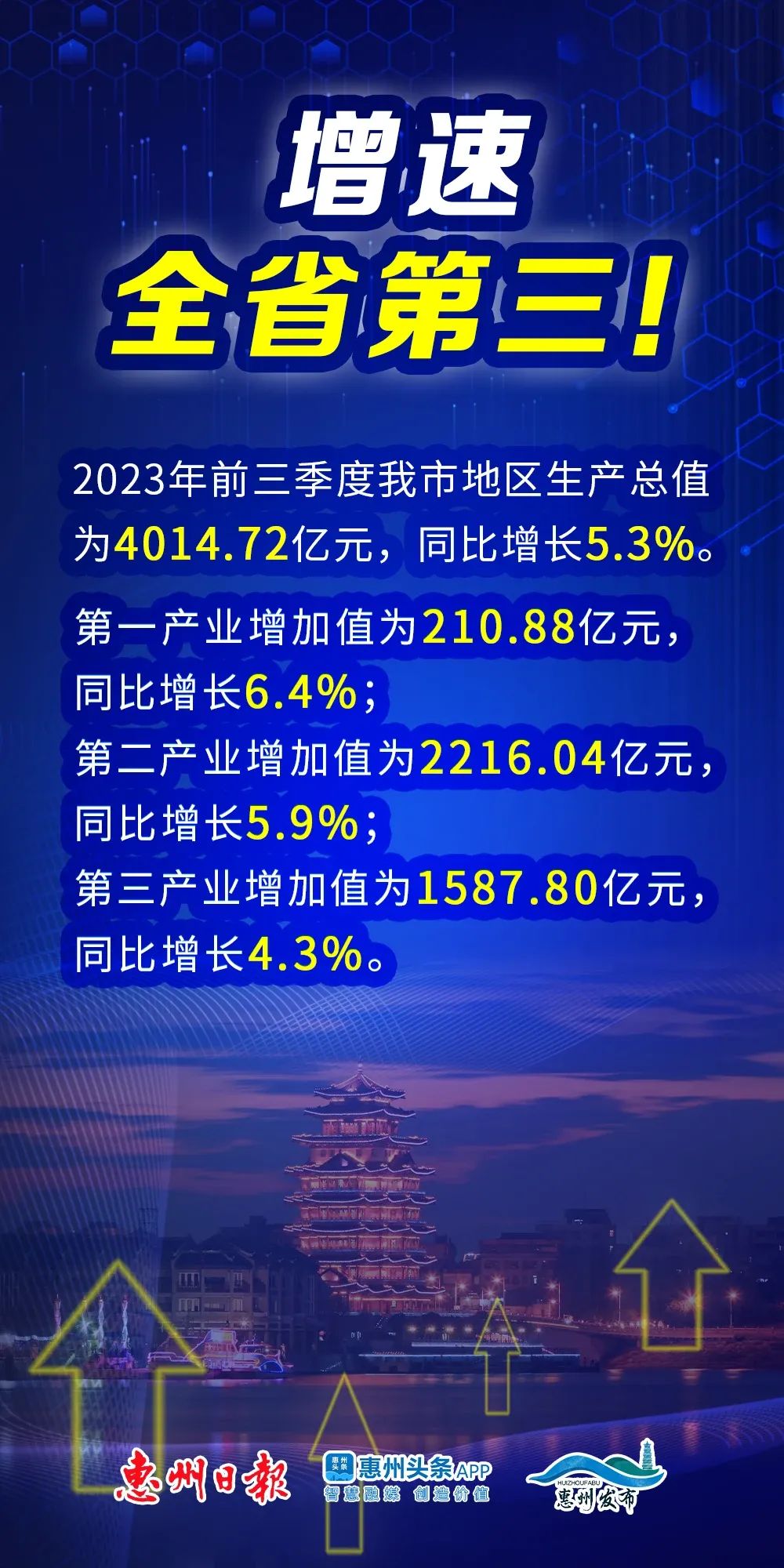 10月24日,惠州今年前三季度經(jīng)濟(jì)運(yùn)行數(shù)據(jù)出爐。根據(jù)地區(qū)生產(chǎn)總值統(tǒng)一核算結(jié)果,2023年前三季度惠州地區(qū)生產(chǎn)總值(GDP)為4014.72億元,同比增長(zhǎng)5.3%,增速居全省第三、珠三角第二。
