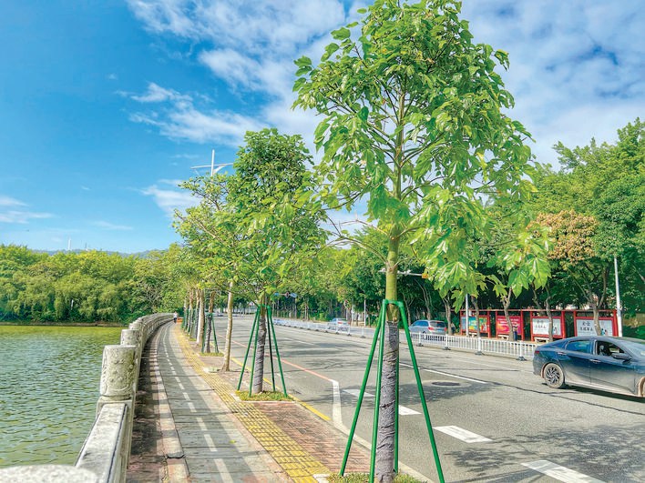 “改造前鱷湖路行道樹以刺桐為主,樹木老化嚴(yán)重,普遍長勢衰老,病蟲害嚴(yán)重,樹干腐爛蟲蛀出現(xiàn)空洞,隨時有倒下的可能。本次提升改造以精細(xì)化景觀提升為目標(biāo)。”現(xiàn)場施工人員介紹,項(xiàng)目嚴(yán)格按照既定目標(biāo)任務(wù),合理安排施工工期,打造特色景觀,確保各項(xiàng)綠化工程有序推進(jìn)。