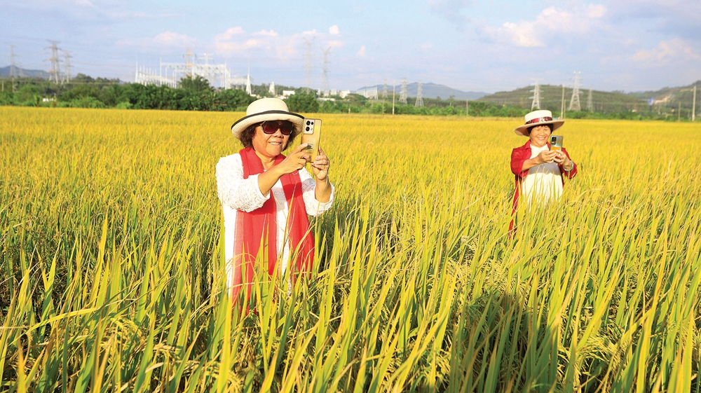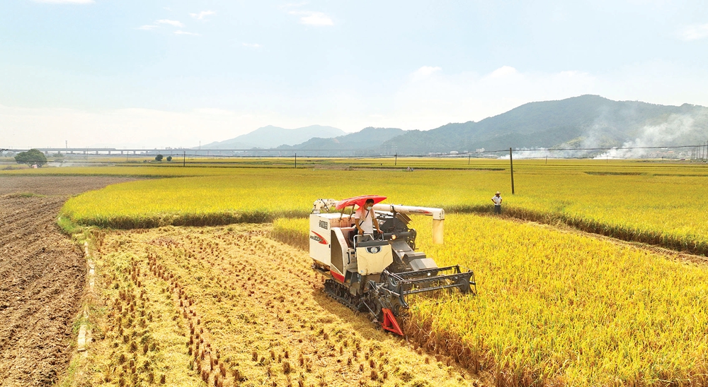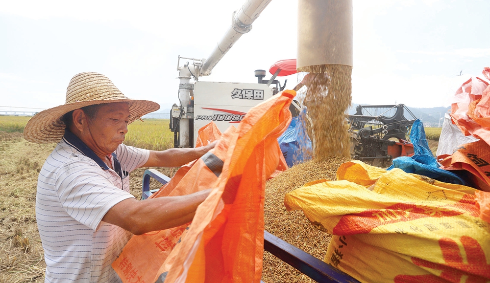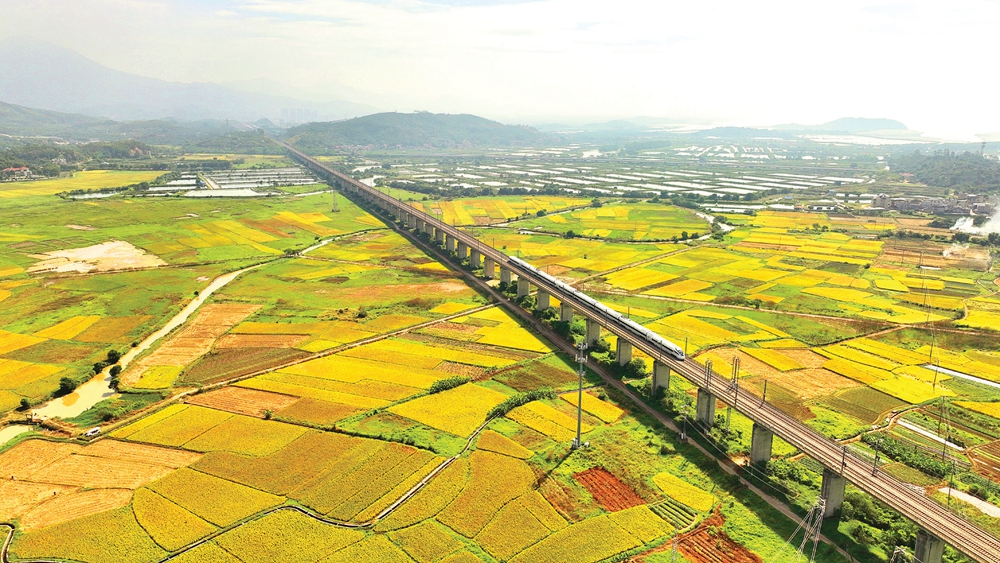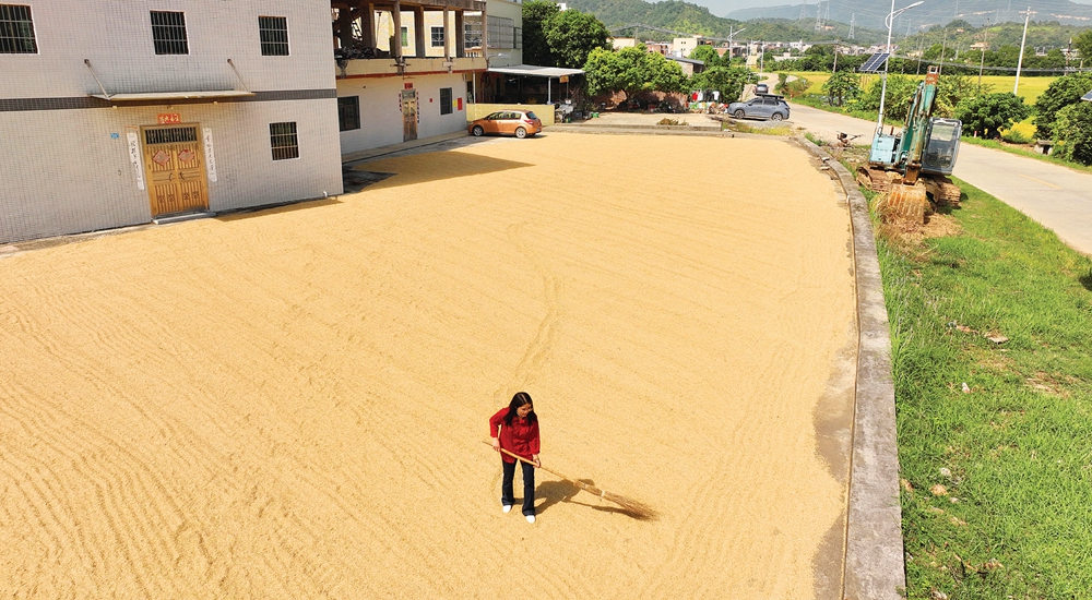 博羅縣園洲鎮(zhèn)九優(yōu)糧油種植基地內(nèi),收割機(jī)在金黃的稻田上來回作業(yè),收割、脫粒、碎稈還田等工序一氣呵成。惠東縣稔山鎮(zhèn)老坑村、竹園村等鄉(xiāng)村里,村民將農(nóng)機(jī)收割的稻谷裝袋,笑容滿面,滿載而歸。這頭,農(nóng)民在自家小院里曬稻谷,金黃的稻谷鋪滿院落;那頭,村民借助機(jī)器收取晾曬好的稻谷,省時(shí)省工;遠(yuǎn)處,高鐵列車在金黃的稻田間疾馳而過,伴著農(nóng)機(jī)運(yùn)作的轟鳴聲,奏響鄉(xiāng)村振興協(xié)奏曲。