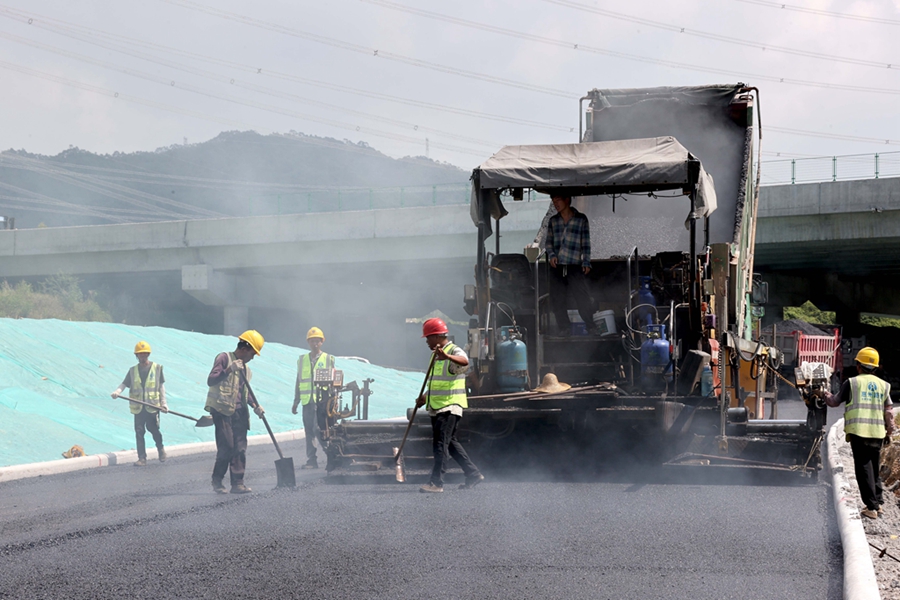 施工人員在攤鋪瀝青路面。 惠州日報記者李松權(quán) 羅劍業(yè)