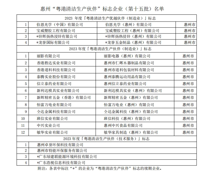 附:惠州“粵港清潔生產(chǎn)伙伴”標(biāo)志企業(yè)(第十五批)名單