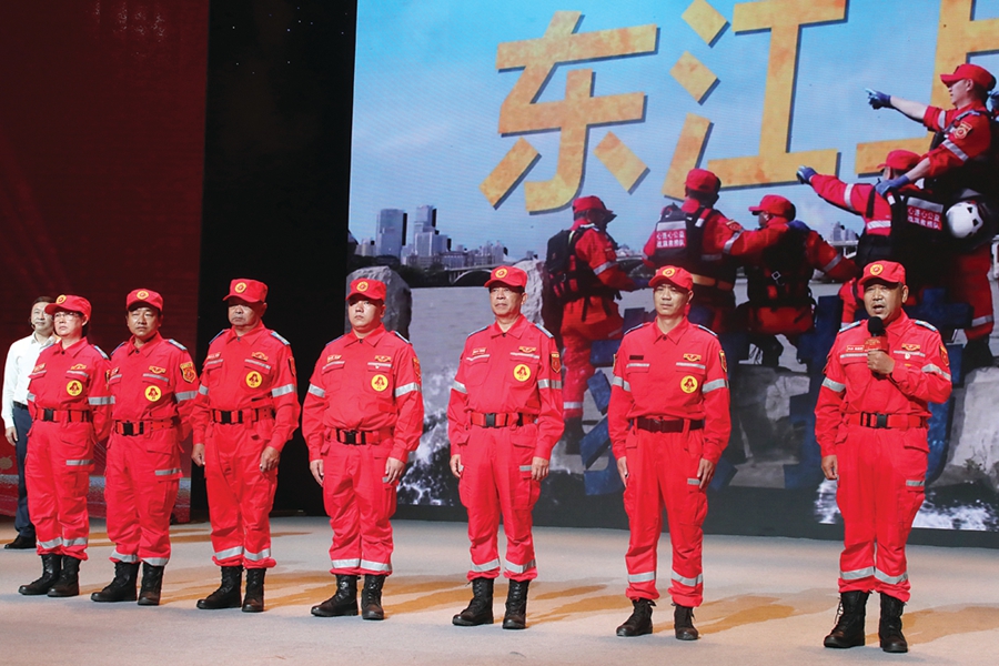 惠州市心連心公益協(xié)會(huì)黨支部書(shū)記、戰(zhàn)旗救撈隊(duì)隊(duì)長(zhǎng)趙喜昌帶領(lǐng)團(tuán)隊(duì)上臺(tái)宣講;葜萑?qǐng)?bào)記者鐘暢新 攝
