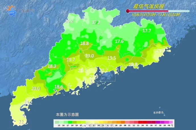 10月31日到11月1日,全省大部分市縣晴天,部分市縣早晨有輕霧。最低氣溫:粵北和珠江三角洲北部市縣15~18℃,其余大部分市縣18~21℃。