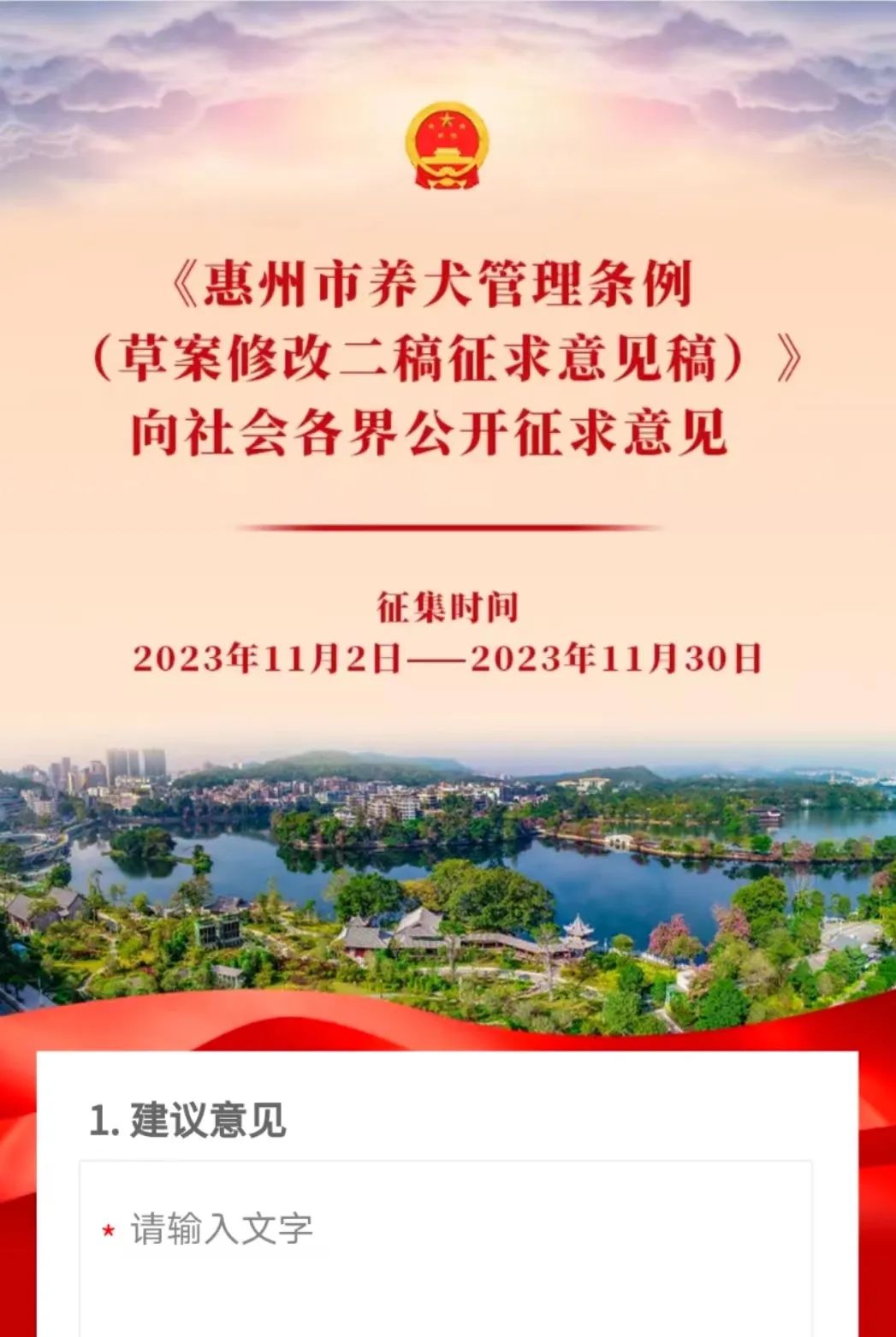 惠報全媒體記者從市人大常委會法工委獲悉,《惠州市養(yǎng)犬管理條例(草案)》將于2023年12月提交市人大常委會會議進行第三次審議。為促進地方立法的民主化、公開化,現(xiàn)將《惠州市養(yǎng)犬管理條例(草案修改二稿征求意見稿)》向社會公開征求意見。歡迎社會公眾、專家學者、企事業(yè)單位、機關團體等提出修改意見。意見征集截止日期為2023年11月30日。
