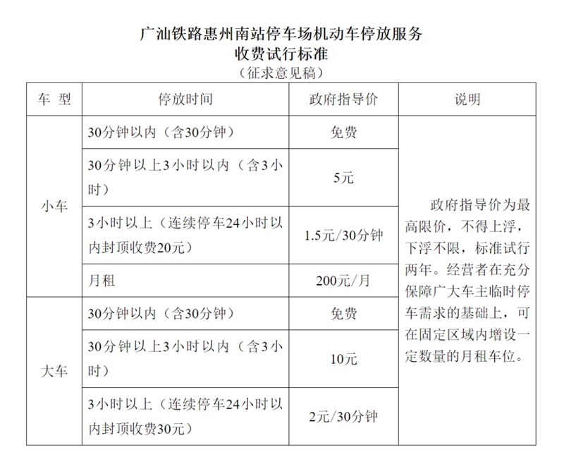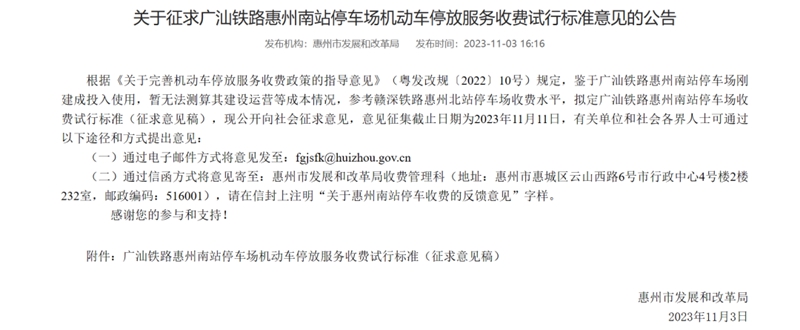 (二)通過信函方式將意見寄至:惠州市發(fā)展和改革局收費管理科(地址:惠州市惠城區(qū)云山西路6號市行政中心4號樓2樓232室,郵政編碼:516001),請在信封上注明“關(guān)于惠州南站停車收費的反饋意見”字樣。