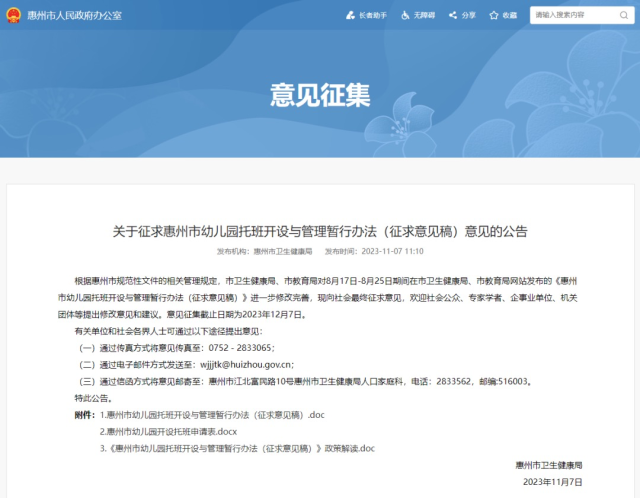 根據(jù)惠州市規(guī)范性文件的相關(guān)管理規(guī)定,市衛(wèi)生健康局、市教育局對(duì)8月17日-8月25日期間在市衛(wèi)生健康局、市教育局網(wǎng)站發(fā)布的《惠州市幼兒園托班開設(shè)與管理暫行辦法(征求意見稿)》進(jìn)一步修改完善,現(xiàn)向社會(huì)最終征求意見,歡迎社會(huì)公眾、專家學(xué)者、企事業(yè)單位、機(jī)關(guān)團(tuán)體等提出修改意見和建議。意見征集截止日期為2023年12月7日。