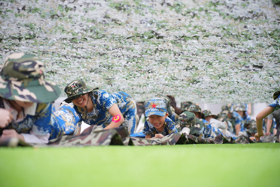 草地上架空著一張迷彩網(wǎng),教官一聲令下,家長(zhǎng)們帶著孩子匍匐前進(jìn),一個(gè)接一個(gè)打探敵情,開展競(jìng)速比拼,個(gè)個(gè)有模有樣。