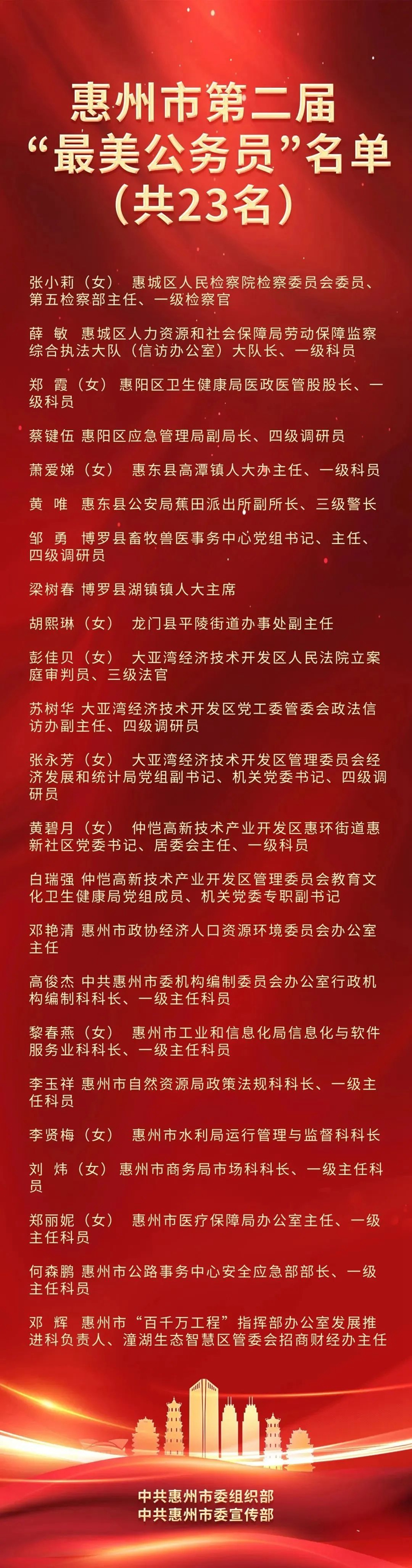 惠州日?qǐng)?bào)訊 (記者歐陽(yáng)成 香金群 通訊員惠市組)11月9日,市委組織部、市委宣傳部公布惠州市第二屆“最美公務(wù)員”和“最美公務(wù)員集體”評(píng)選結(jié)果,共23名個(gè)人、16個(gè)集體獲殊榮。