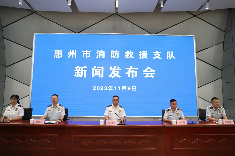 11月9日上午,惠州市人民政府新聞辦公室新聞發(fā)布廳舉行“高質(zhì)量發(fā)展看惠州”系列主題新聞發(fā)布會(huì)第6場(chǎng)之“惠州消防這五年”新聞發(fā)布會(huì),就惠州消防改革這五年來(lái)取得的成績(jī)和群眾關(guān)心的熱點(diǎn)話題進(jìn)行介紹和解讀,并回答記者提問(wèn)。惠州市消防救援支隊(duì)副支隊(duì)長(zhǎng)田創(chuàng)明等出席發(fā)布會(huì)。南方日?qǐng)?bào)、羊城晚報(bào)、廣東廣播電視臺(tái)、南方都市報(bào)、廣州日?qǐng)?bào)、深圳特區(qū)報(bào)、香港商報(bào)、惠州日?qǐng)?bào)、惠州市廣播電視臺(tái)、今日惠州網(wǎng)等十余家媒體記者參加發(fā)布會(huì)。