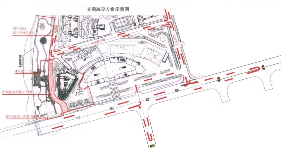 二、臨時交通管制方案:施工期間,河壩路局部道路(人民四路至天安西一路區(qū)間路段)實施全封閉施工,過往車輛建議繞行天安南路(見下圖)。