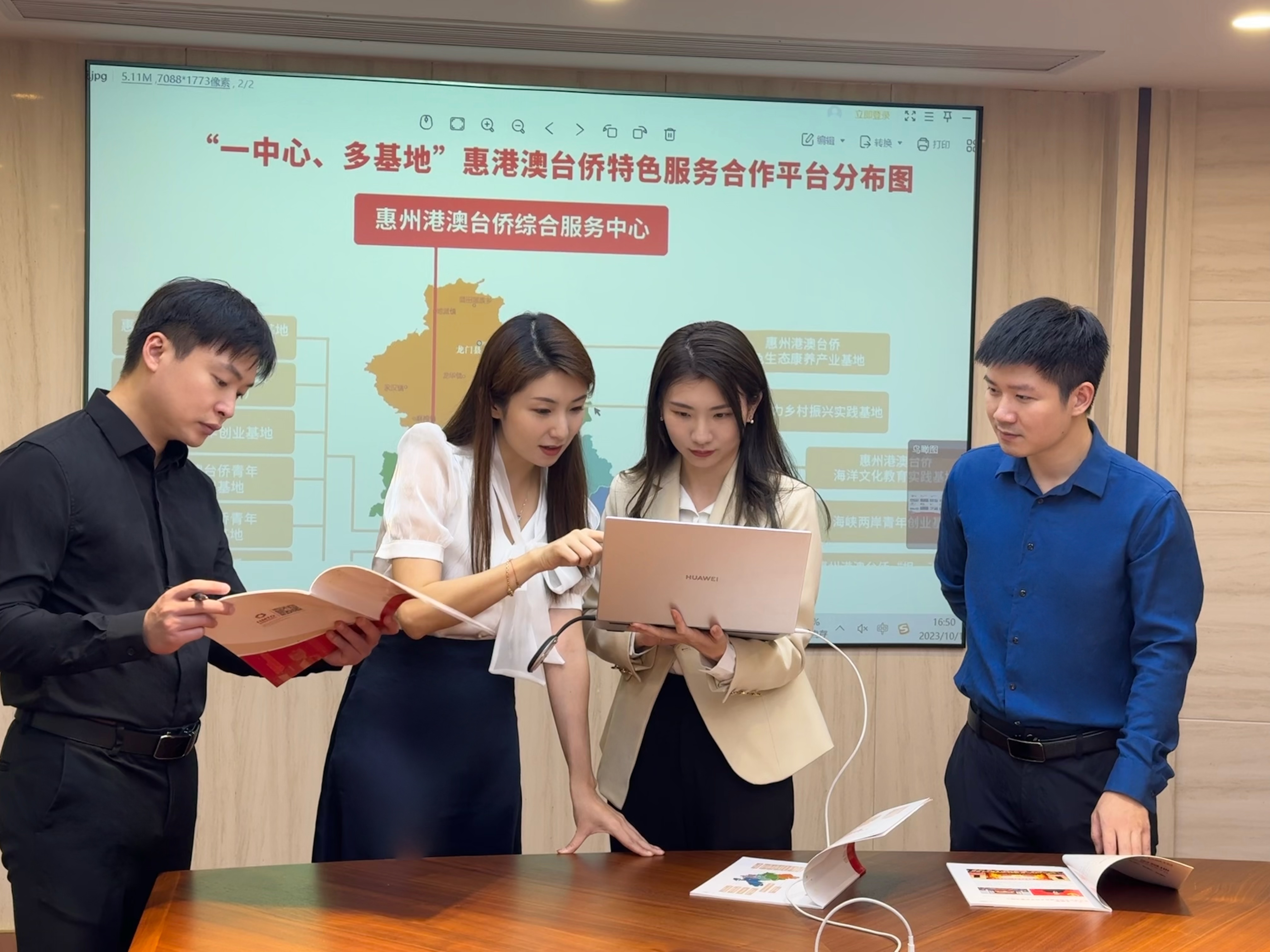 市委統(tǒng)戰(zhàn)部港澳工作科工作人員在討論工作。