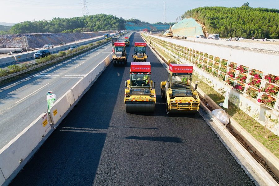 項(xiàng)目瀝青試驗(yàn)段攤鋪現(xiàn)場(chǎng)。據(jù)介紹,項(xiàng)目首個(gè)瀝青試驗(yàn)段長(zhǎng)度為500米,攤鋪寬度10米,厚度11厘米,攤鋪面積5000平方米!笆┕み^程中,我們配置了1臺(tái)攤鋪機(jī)、3臺(tái)雙鋼輪壓路機(jī)、2臺(tái)30噸膠輪臺(tái)壓路機(jī),嚴(yán)格按照高頻、慢壓的要求,由技術(shù)人員實(shí)時(shí)跟進(jìn)質(zhì)量檢測(cè),現(xiàn)場(chǎng)驗(yàn)證工序銜接和攤鋪工藝的合理性,確保路面瀝青層平整度和厚度符合設(shè)計(jì)標(biāo)準(zhǔn)!表(xiàng)目T9標(biāo)現(xiàn)場(chǎng)負(fù)責(zé)人表示。