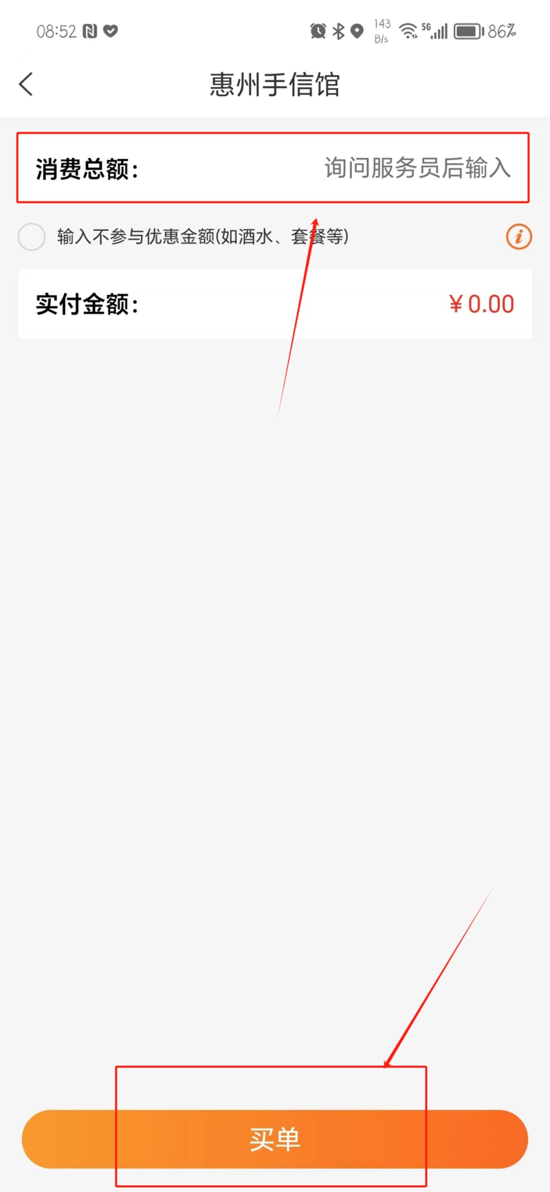 7.輸入店員提供的金額后,進(jìn)入買(mǎi)單