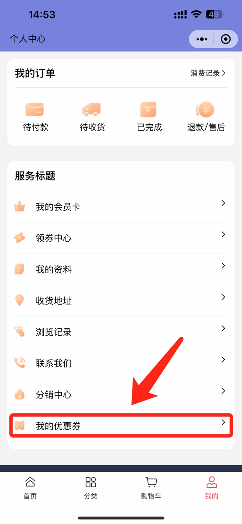 4.找到“我的優(yōu)惠券”即可進(jìn)入消費(fèi)券頁(yè)面