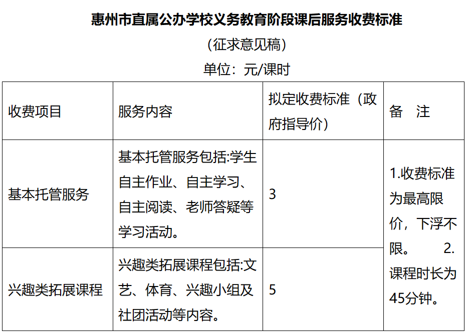 課后服務擬定收費標準(政府指導價)為