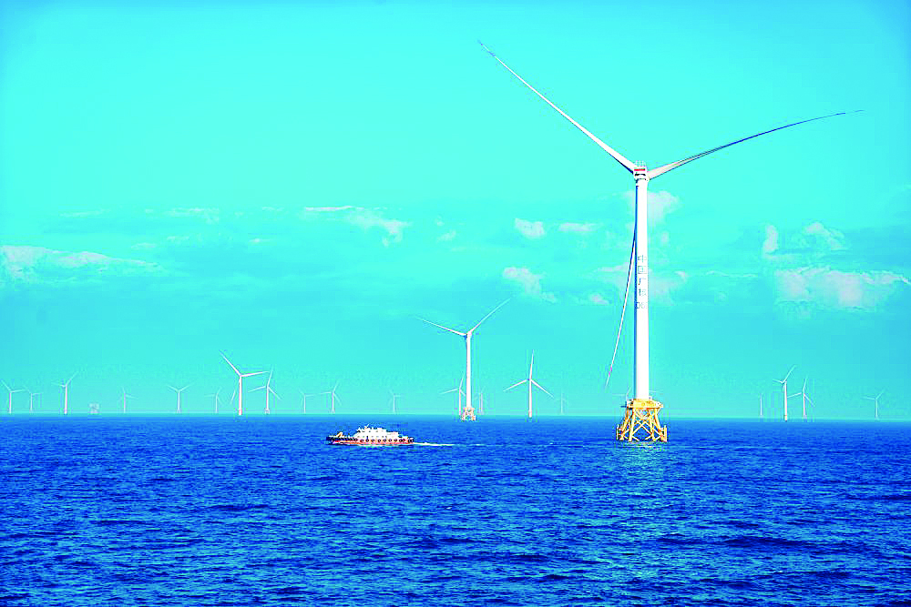 在惠東縣稔平半島以南的海域,40臺單支葉片長達(dá)86.5米的風(fēng)機(jī)佇立在湛藍(lán)的海上,海風(fēng)吹動葉輪,風(fēng)動就轉(zhuǎn)化為電能,點(diǎn)亮萬家燈火。在它們的旁邊,新的風(fēng)機(jī)安裝正在有序開展,到今年底,這里將新屹立64臺機(jī)組。