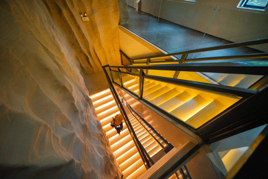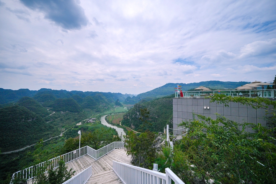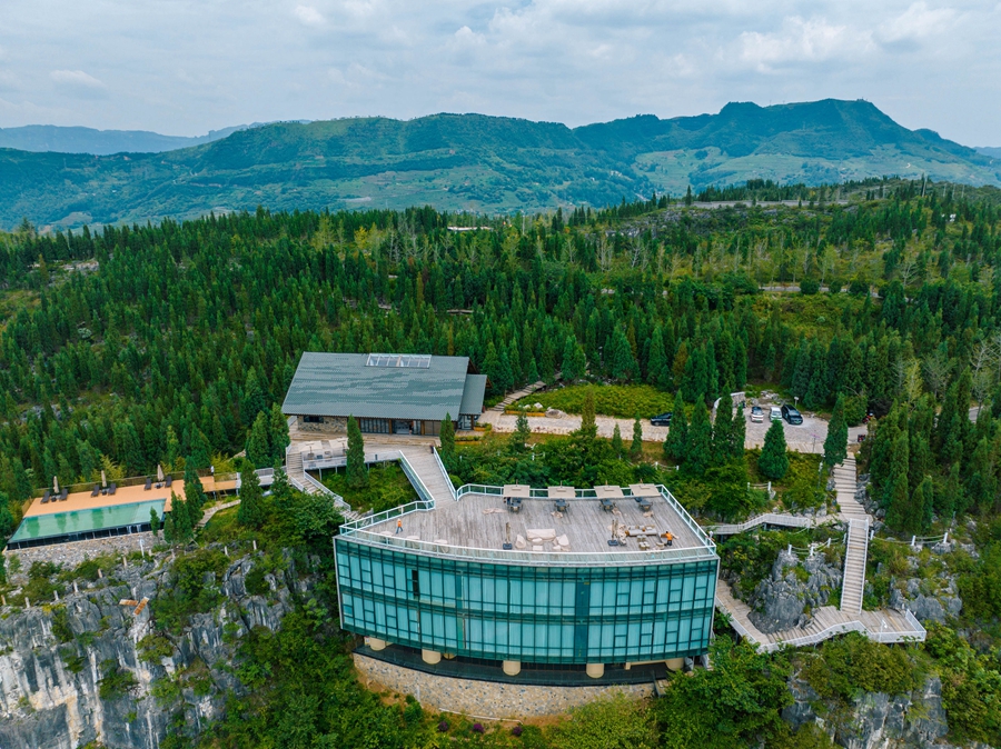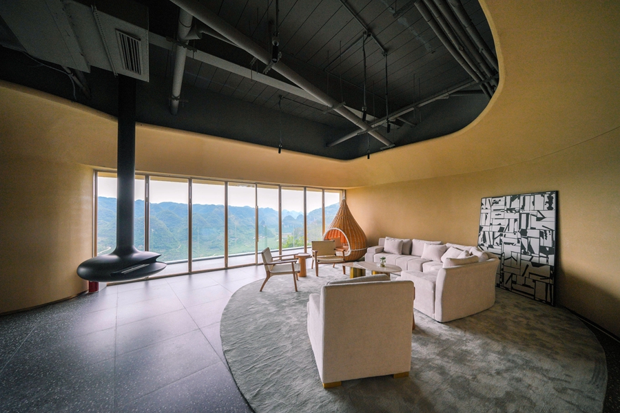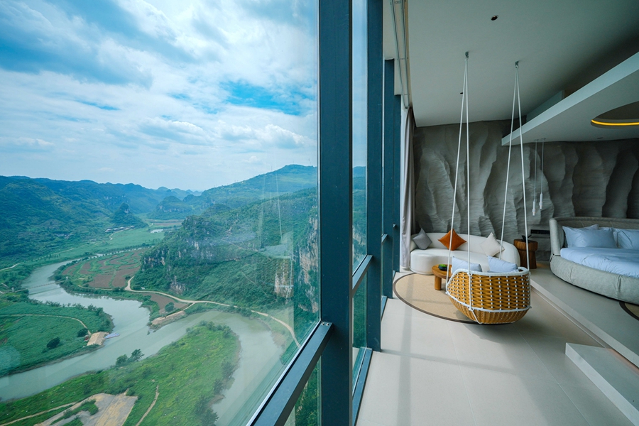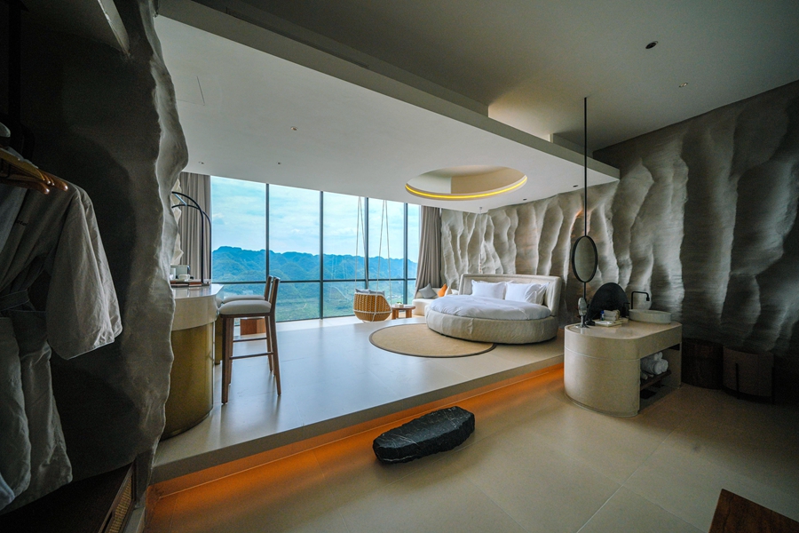 為解決“如何讓游客留得下來”的問題,安龍縣世紀投資文旅發(fā)展有限公司首先將溶巖美術館改造成為獨具特色的懸崖酒店。該公司執(zhí)行董事吳斌介紹,美術館的內部被改造成11間客房+一個公共活動空間,房間以溶巖秘境風格裝修,走進去仿佛穿越到史前。透過房間的落地窗,眺望峰林、峭壁、山谷、河流等喀斯特地貌景觀,更可感受與自然融為一體的喜悅與神奇。酒店屋頂被打造為觀景臺,一旁還配了無邊際泳池,徜徉其中,看云卷云舒,觀浩瀚星空,自在山水間。