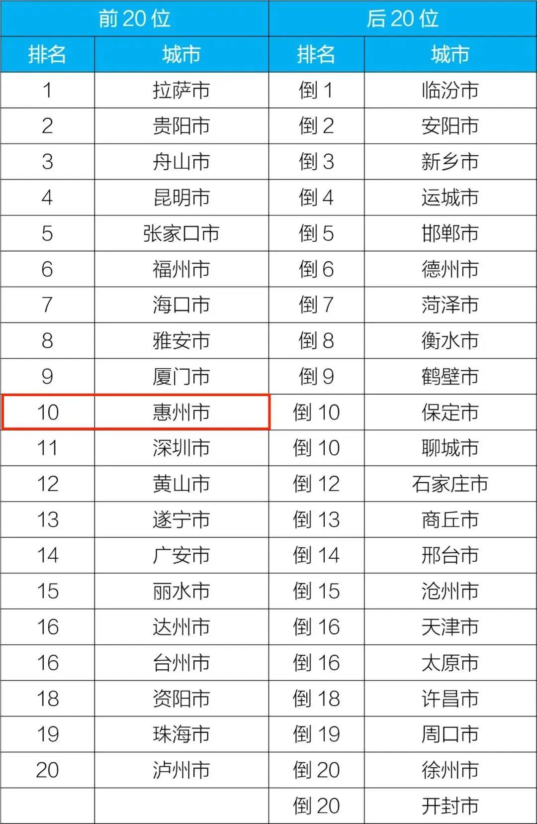 10月,惠州空氣質量排名全國第十