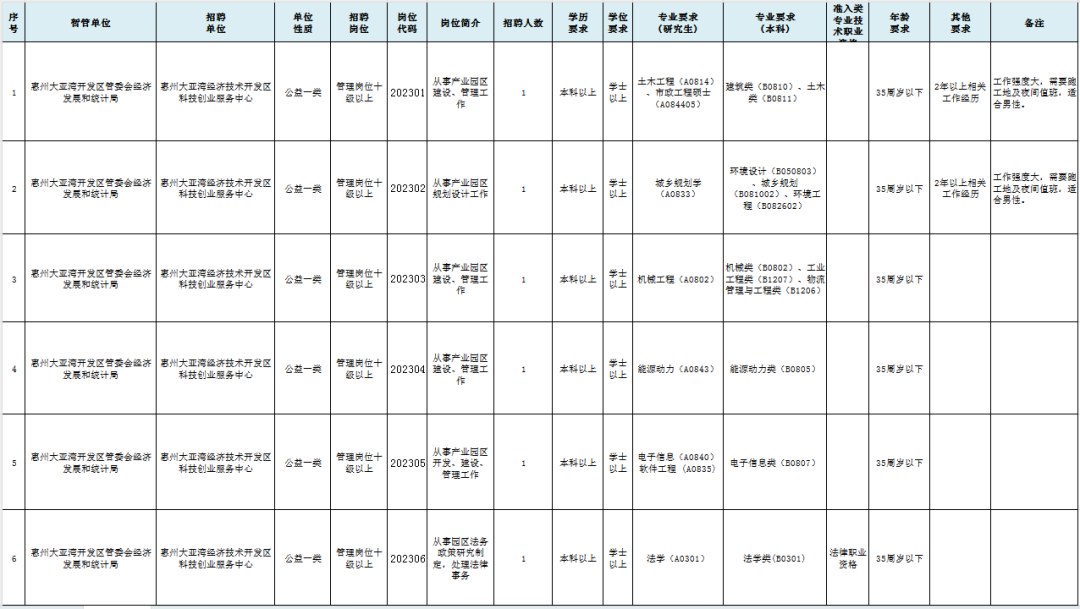 本次公開招聘的事業(yè)單位為大亞灣開發(fā)區(qū)科技創(chuàng)業(yè)服務(wù)中心,共6個(gè)崗位。(具體招聘啟事請(qǐng)登錄惠州大亞灣開發(fā)區(qū)官網(wǎng)查看)