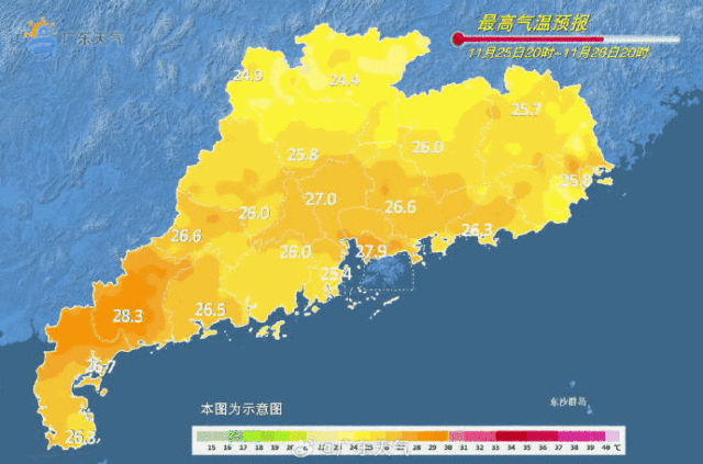 28日,西部市縣晴間多云,中東部市縣晴間少云。最低氣溫:粵北的北部市縣11℃~15℃,南部沿海市縣18℃~21℃,其余市縣14℃~18℃。