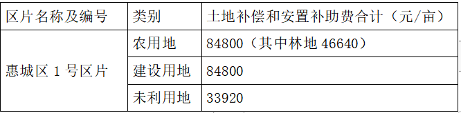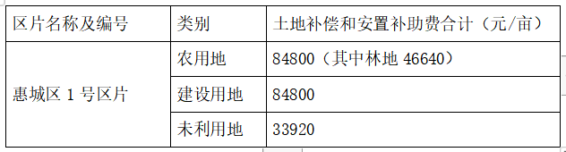 土地補償費和安置補助費按《惠州市人民政府關(guān)于公布實施征收農(nóng)用地區(qū)片綜合地價的公告》(惠府公〔2021〕4號)規(guī)定的惠城區(qū)1號區(qū)片綜合地價標(biāo)準(zhǔn)執(zhí)行,其中全市統(tǒng)一設(shè)定林地調(diào)節(jié)系數(shù)0.55,征收建設(shè)用地參照征收農(nóng)用地區(qū)片綜合地價執(zhí)行,征收未利用地參照征收農(nóng)用地區(qū)片綜合地價設(shè)定調(diào)節(jié)系數(shù)0.4執(zhí)行。