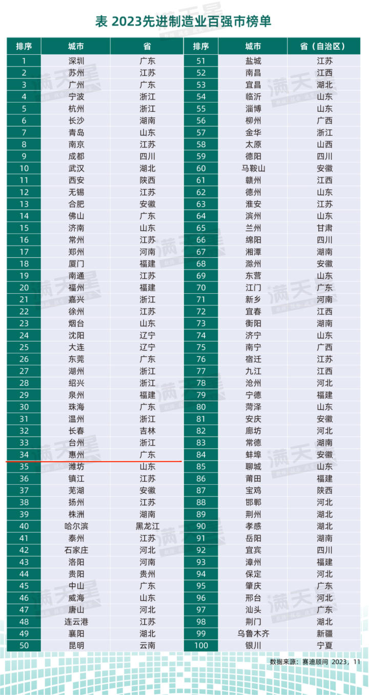 惠州榜上有名,位列34位。