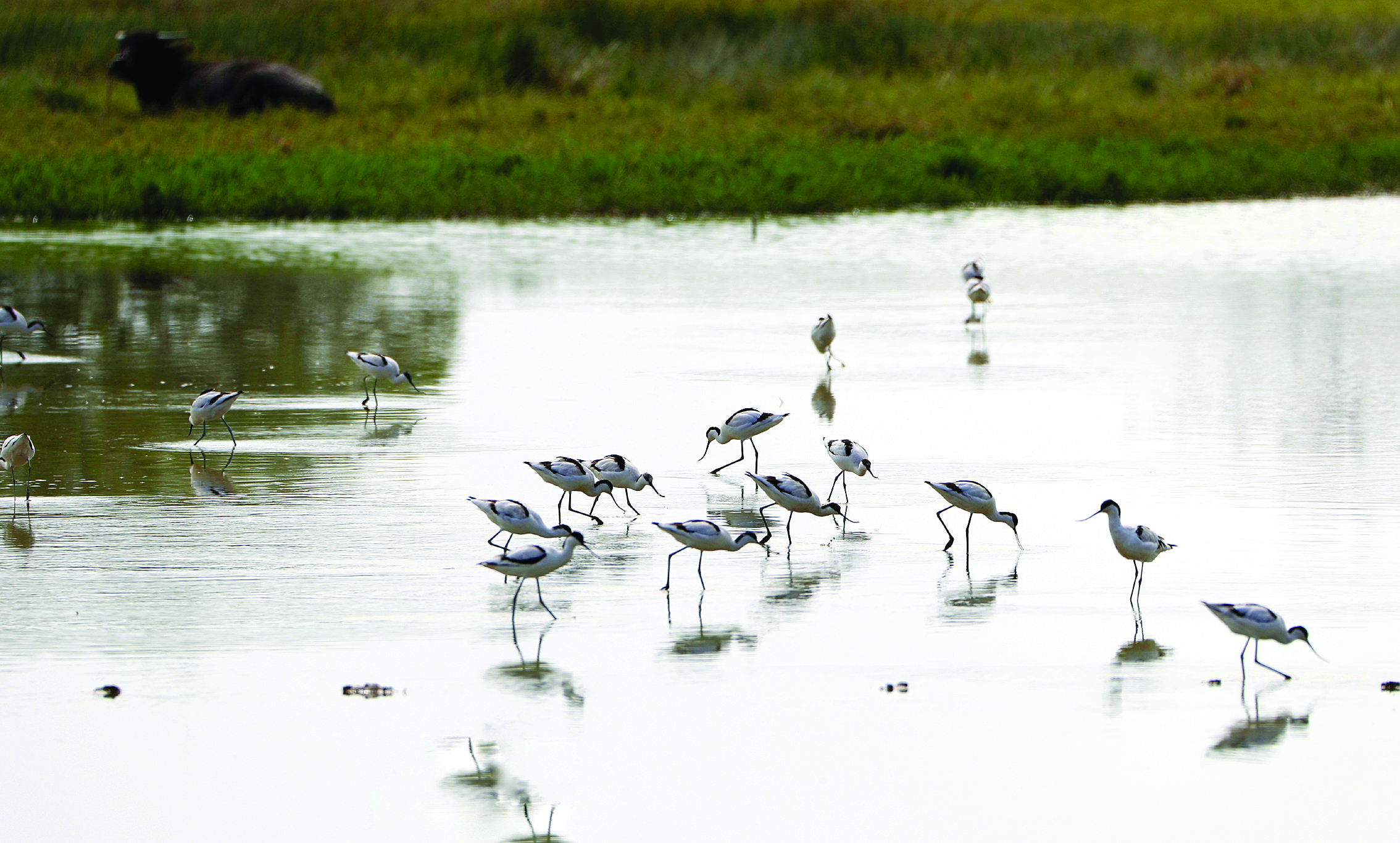 成群的反嘴鷸在濕地上覓食。
