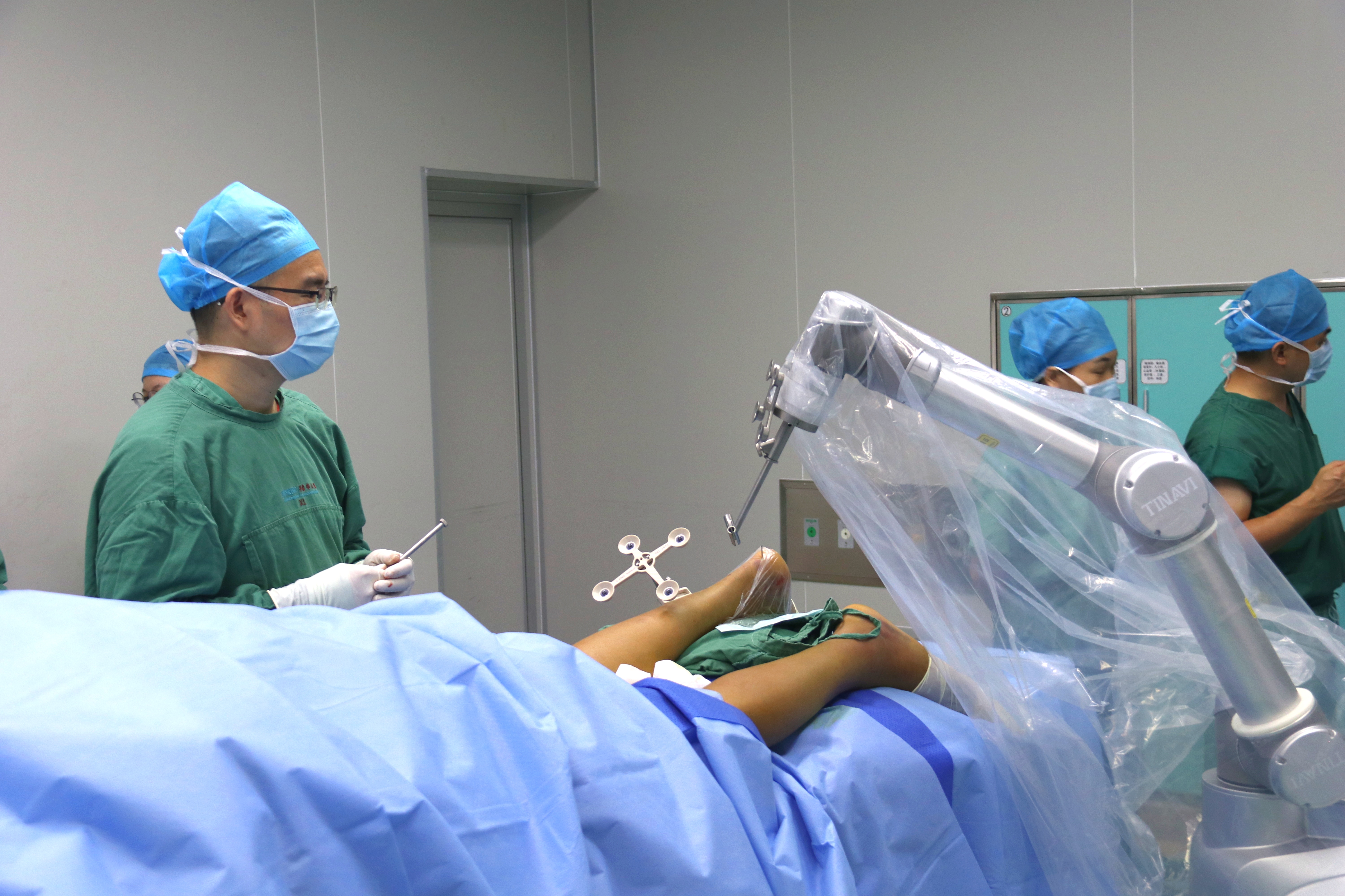 在惠州華康醫(yī)院手術(shù)室內(nèi),一臺雙側(cè)跟骨粉碎性骨折手術(shù)正在緊鑼密鼓地進行中。除了手術(shù)專家團隊、麻醉醫(yī)生和手術(shù)護士以外,手術(shù)室里還多了一位新幫手——“天璣骨科手術(shù)機器人”。