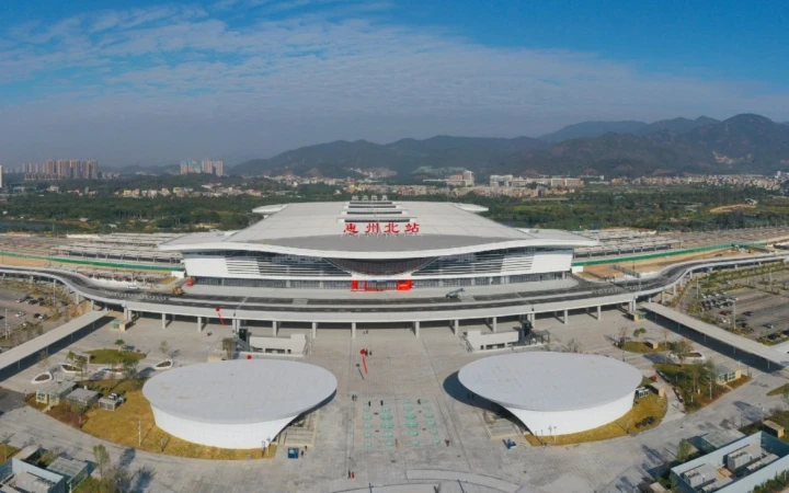 贛深高鐵是連接江西省贛州市與廣東省深圳市的高速鐵路,是我國“八縱八橫”高速鐵路主通道之一“京港(臺)通道”的重要組成部分;葜荼闭臼勤M深高鐵新建的最大站房,位于惠城區(qū)小金口街道。站房形式為設(shè)有高架候車室的線側(cè)平站,站場為7臺16線,2021年12月10日正式開通運營。