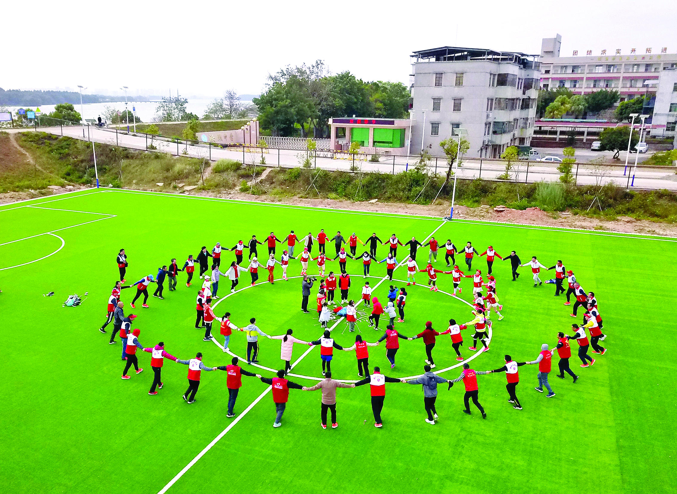 撿跑志愿者跑前熱身,圍成一個圈,隨著音樂舞動。