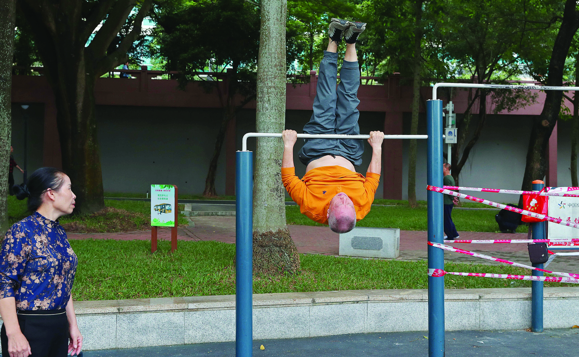 市民在單杠上玩得挺“花哨”。