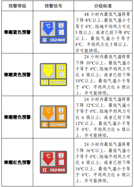 按照《寒潮預(yù)警信號(hào)及防御指南》規(guī)定,寒潮預(yù)警信號(hào)分四級(jí)。