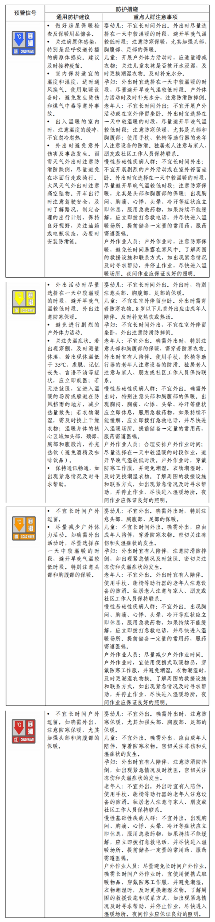 針對(duì)寒潮預(yù)警信號(hào)等級(jí),我們提出分級(jí)人群防護(hù)措施建議。