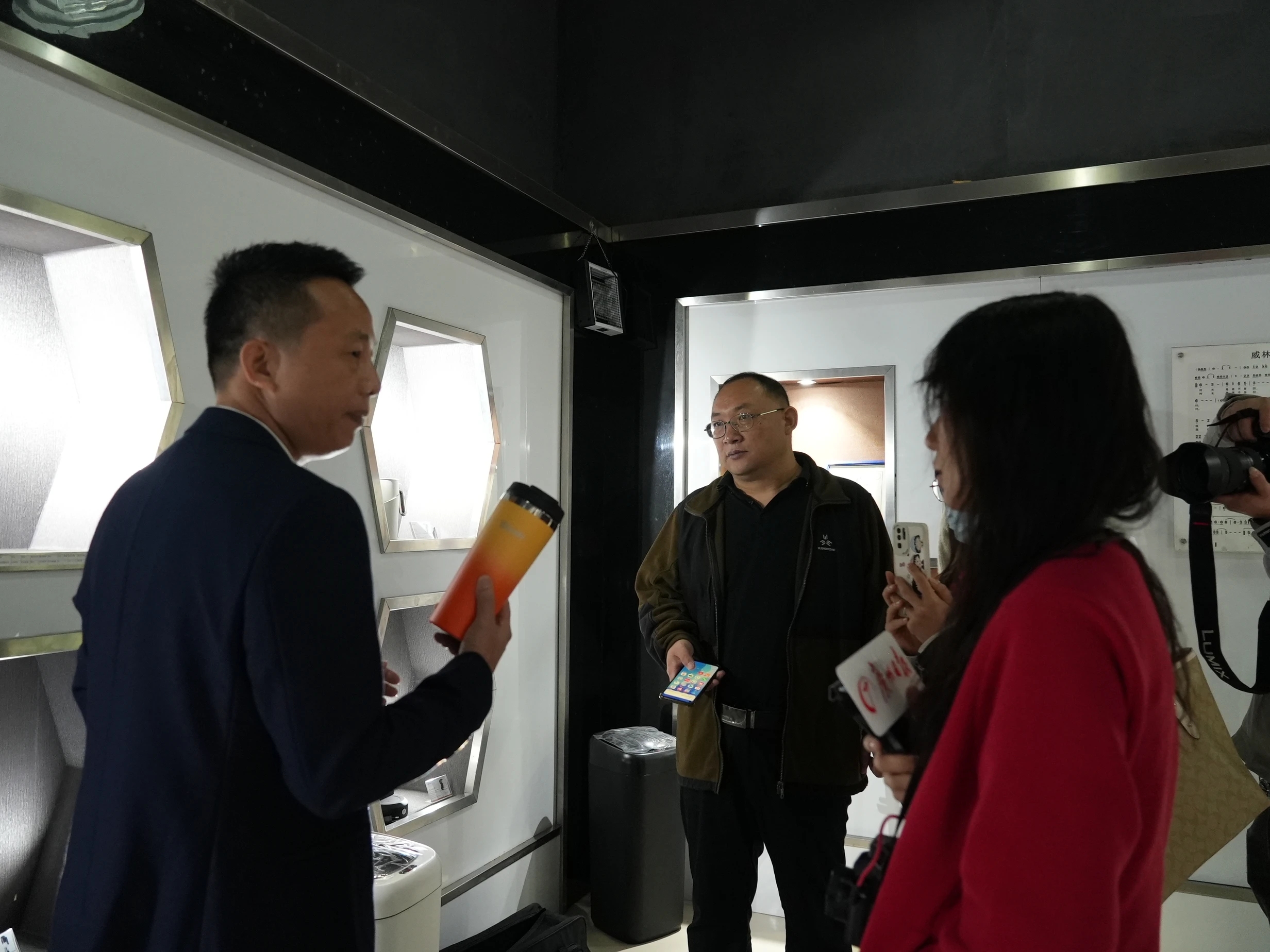 廣東威林科技股份有限公司董事長(zhǎng)葉景濃給媒體記者講解產(chǎn)品功能。