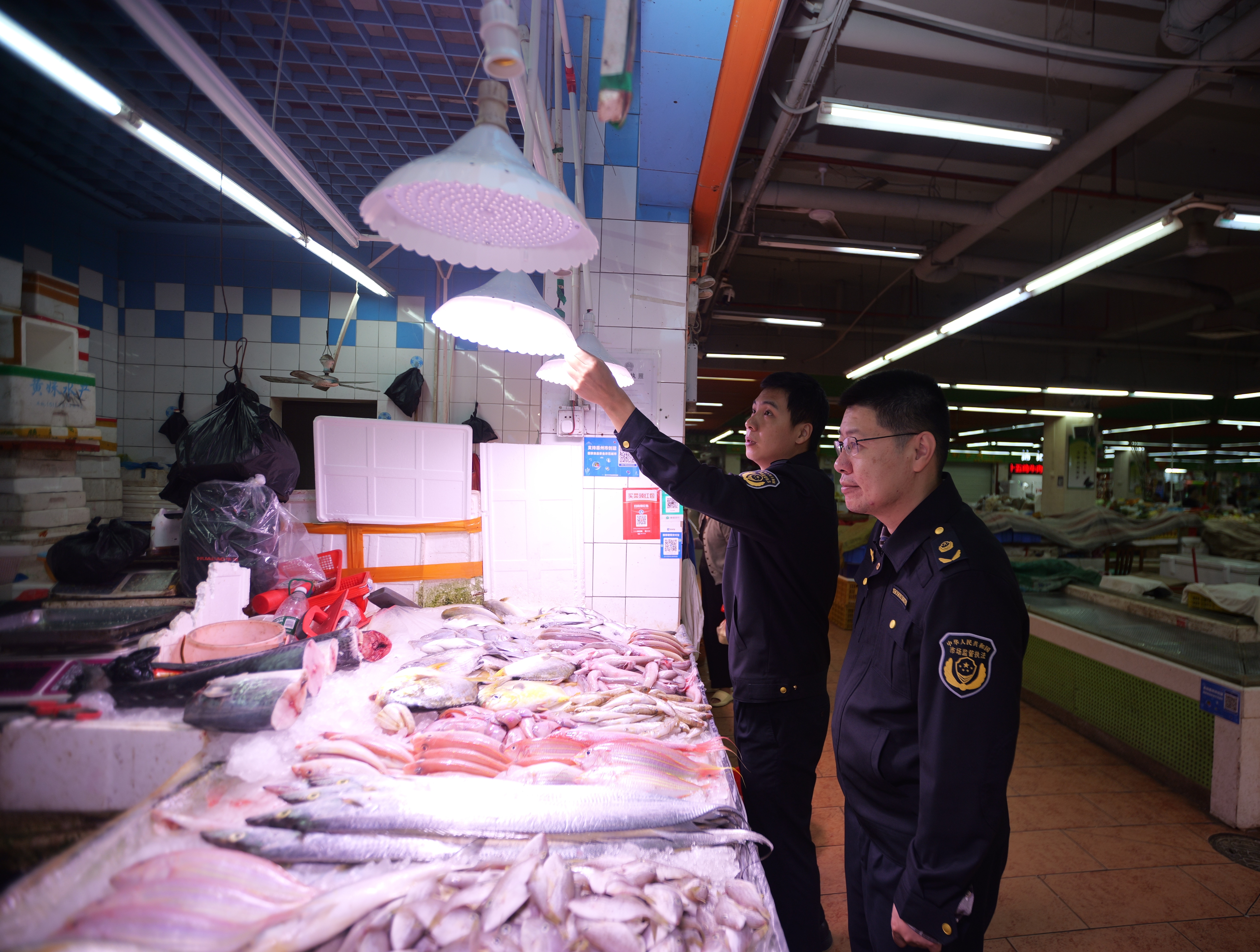 執(zhí)法人員到集貿(mào)市場(chǎng)檢查照明燈具使用情況;葜萑?qǐng)?bào)記者黃鑫威 攝
