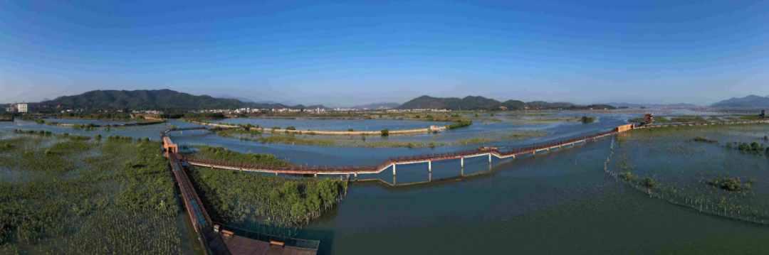 在好招樓市級(jí)濕地公園放眼望去,海岸線和海岸帶綿延不絕,紅樹林生長(zhǎng)茂盛,呈環(huán)狀分布在考洲洋畔;近處海面上,船只競(jìng)相出海,漣漪陣陣,呈現(xiàn)出人與自然和諧共生的美麗圖景。