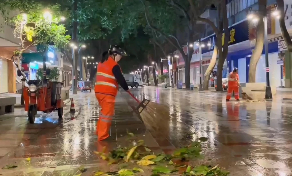 惠州市區(qū)環(huán)衛(wèi)工人凌晨在清理路面落葉、垃圾。(視頻截圖)