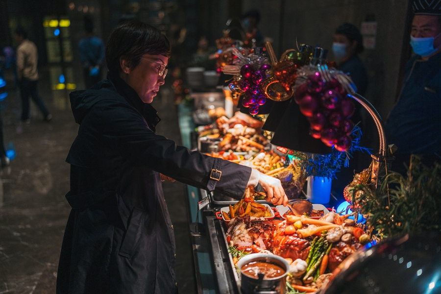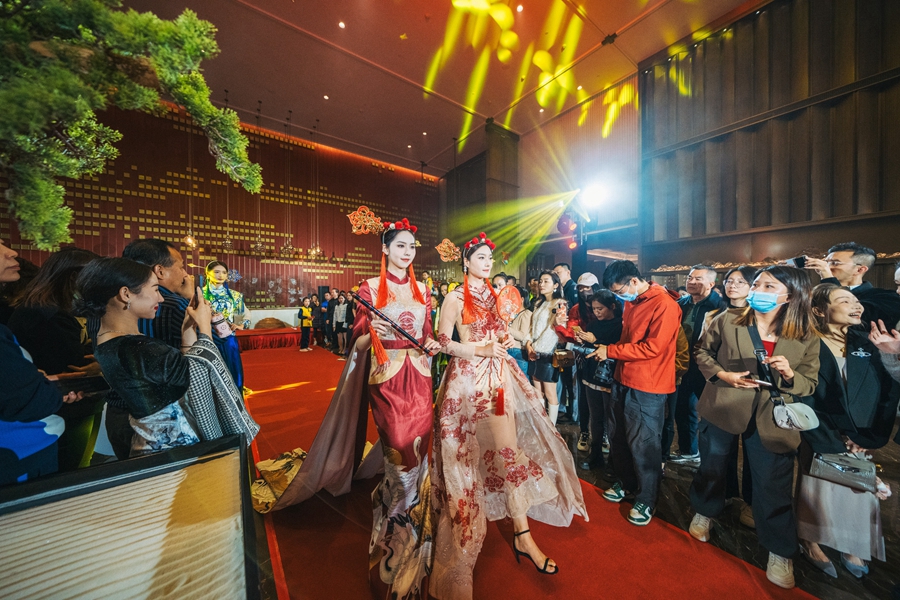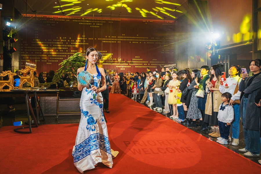 “在如此華麗的國(guó)潮走秀中迎接新年,著實(shí)不虛此行。”12月7日晚,來自湖南的游客蘇小姐一家在鉑爾曼酒店大堂內(nèi)欣賞國(guó)風(fēng)時(shí)裝秀,品嘗新年主題小吃,流連忘返。