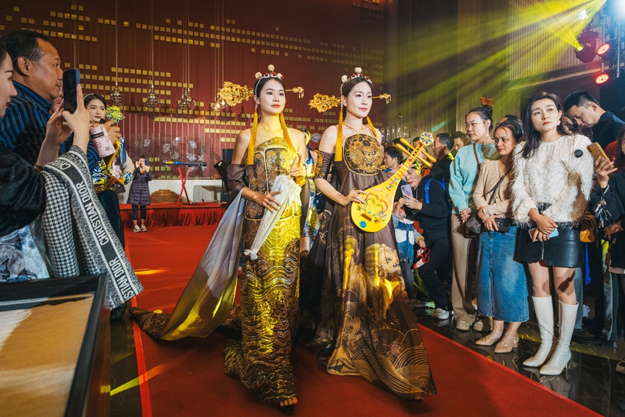 模特們手持琵琶、油紙傘走秀,古意十足。