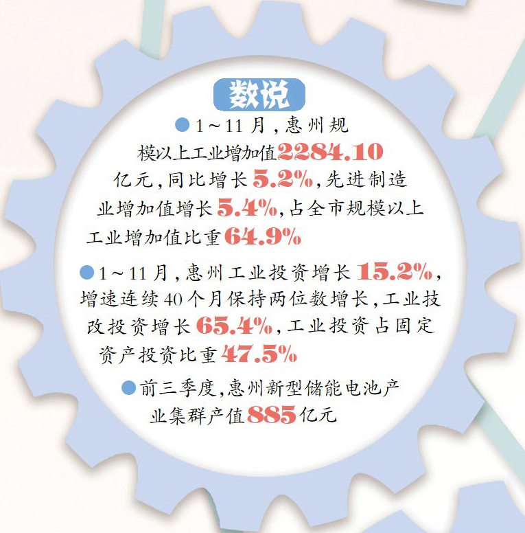 一年來(lái),惠州引進(jìn)一批標(biāo)志性項(xiàng)目落地,呈現(xiàn)出央企、民企、外企同臺(tái)競(jìng)技,以大帶小的生動(dòng)局面。今年前三季度,惠州在建工業(yè)項(xiàng)目1569宗,總投資6880億元,超10億元項(xiàng)目135宗;工業(yè)投資總量居全省第2位,截至今年11月,增速連續(xù)40個(gè)月保持兩位數(shù)增長(zhǎng)。