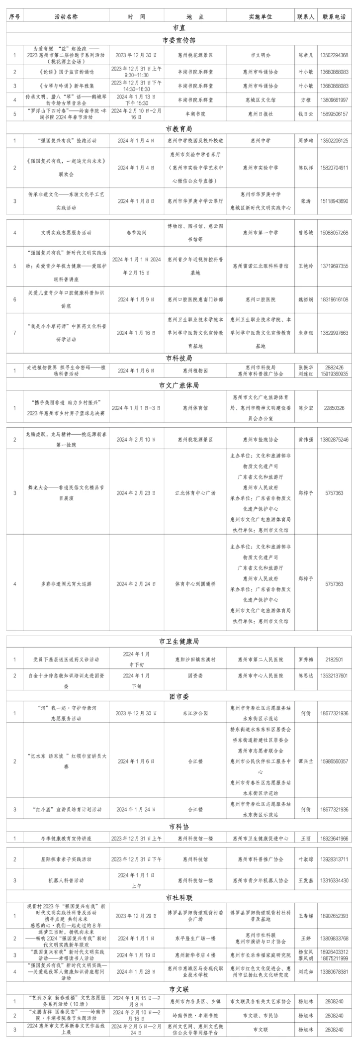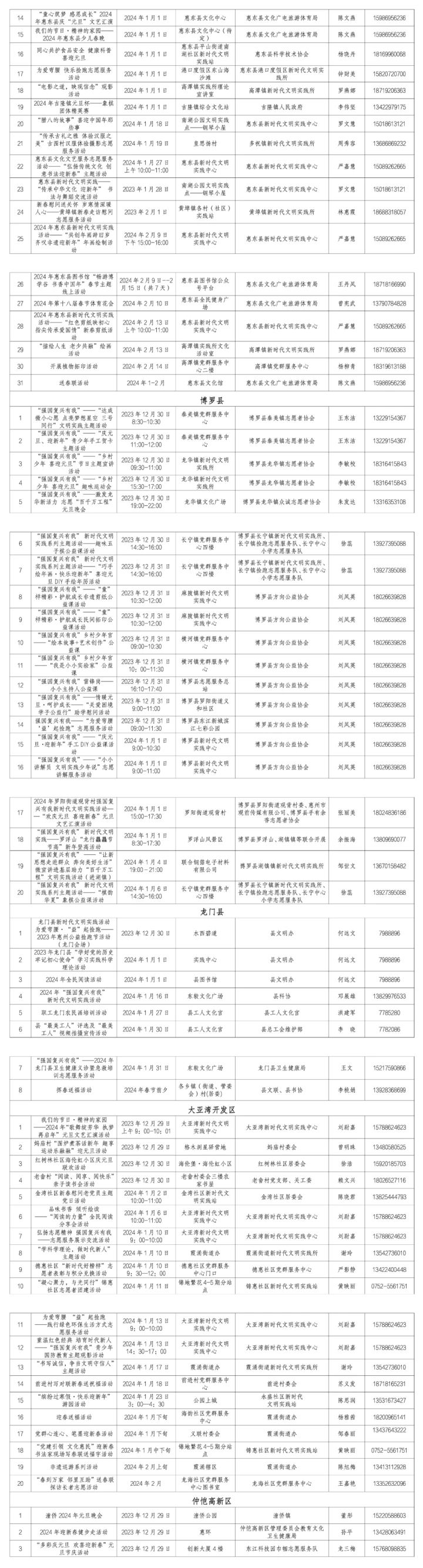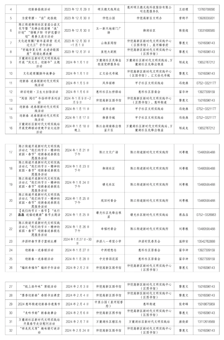 我們的節(jié)日·精神的家園、強國復興有我、愛國主義教育、節(jié)日送溫暖、公益撿跑、文化藝術、體育運動、勞動實踐等重點突出、內容豐富、形式新穎、群眾喜聞樂見的各項活動精彩紛呈,喜慶熱鬧的新年氣息撲面而來。本系列活動深入貫徹落實中央、省市推進精神文明建設高質量發(fā)展的決策部署,進一步推進常態(tài)化開展新時代文明實踐活動工作,豐富惠州元旦春節(jié)期間文化生活。
