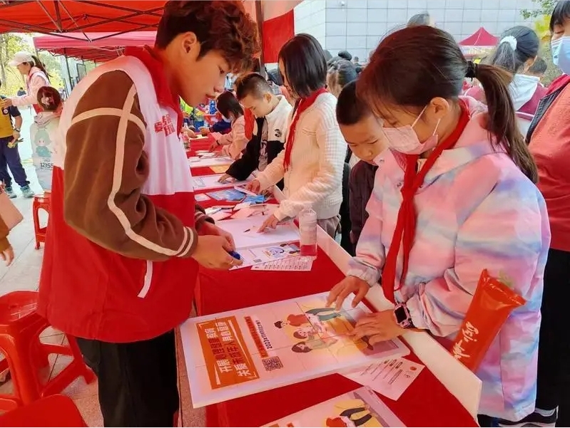 “什么是新時代生態(tài)文明建設的重要目標?”“美麗中國!”少先隊員們一個個有序答題闖關。在“爭做新時代好隊員”紅領巾校外嘉年華攤位前,市少工委聯(lián)合市青少年宮校外大隊設置了包含禁毒、自護、學法、綠美廣東等4個主題的爭章活動,少先隊員們積極參與,勇奪“爭做新時代好隊員”市級特色章。