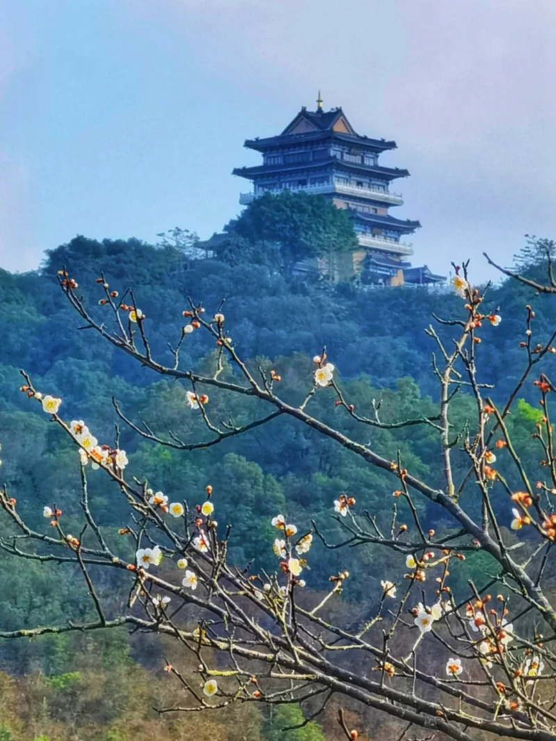 盛放的梅花與遠(yuǎn)處的掛榜閣相得益彰。