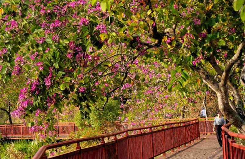 紅花湖景區(qū)棧道上紫荊花盛放,游客在休閑散步。