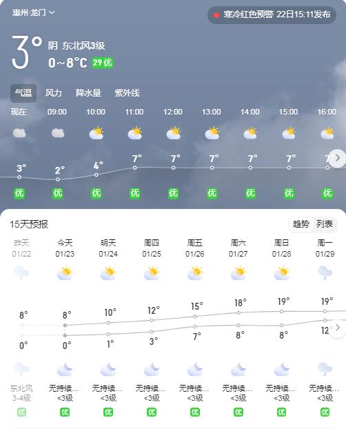 惠州日?qǐng)?bào)訊 (記者劉建威)市氣象臺(tái)預(yù)計(jì),本周前期受強(qiáng)冷空氣補(bǔ)充影響,我市氣溫下降并伴有分散小雨和大風(fēng),局部有霜(冰)凍,日平均氣溫維持在10℃以下,體感陰冷;中后期氣溫逐步回升,晝夜溫差加大。值得關(guān)注的是,預(yù)計(jì)龍門(mén)縣1月23日至24日最低氣溫降至0℃以下,并伴有霜凍和冰凍。龍門(mén)縣氣象臺(tái)于1月22日15時(shí)05分將寒冷橙色預(yù)警信號(hào)升級(jí)為紅色,提醒大家注意防寒防凍。其余縣區(qū)維持寒冷橙色預(yù)警信號(hào)。