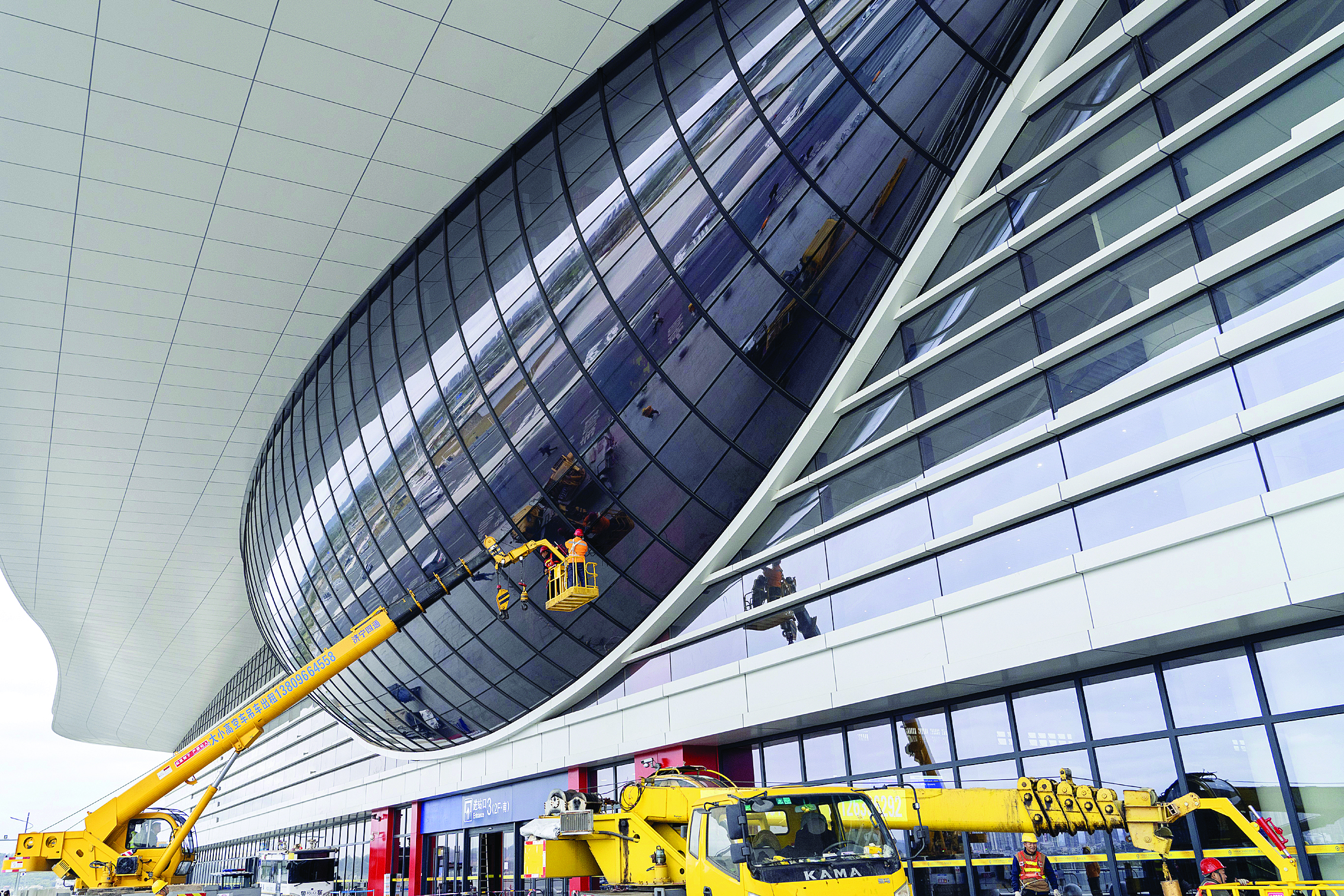 維修作業(yè)時(shí)施工人員通過升降設(shè)備更換異形玻璃。