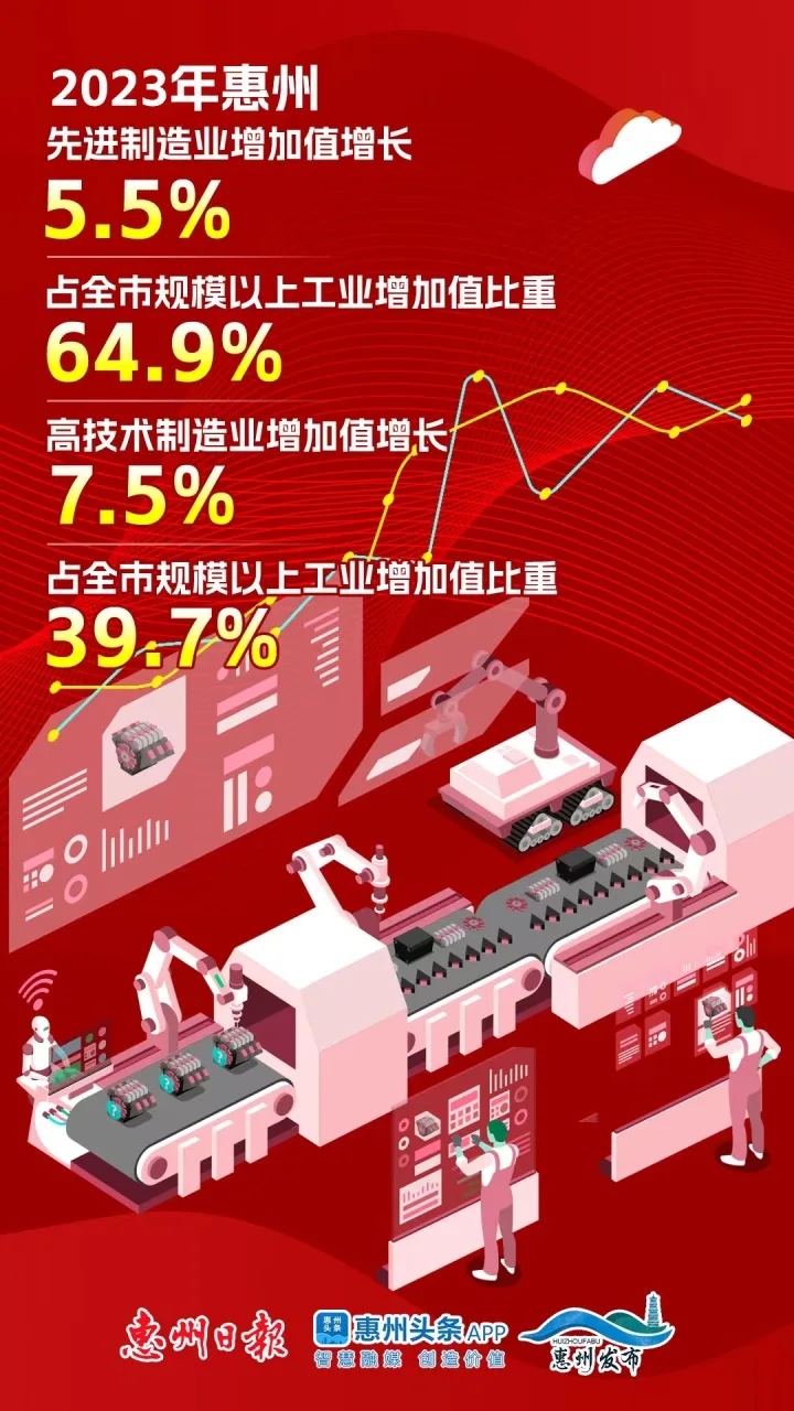 新舊動能加快轉(zhuǎn)換。統(tǒng)計數(shù)據(jù)顯示,去年,惠州先進制造業(yè)增加值增長5.5%,占全市規(guī)模以上工業(yè)增加值比重64.9%;高技術(shù)制造業(yè)增加值增長7.5%,占全市規(guī)模以上工業(yè)增加值比重39.7%。