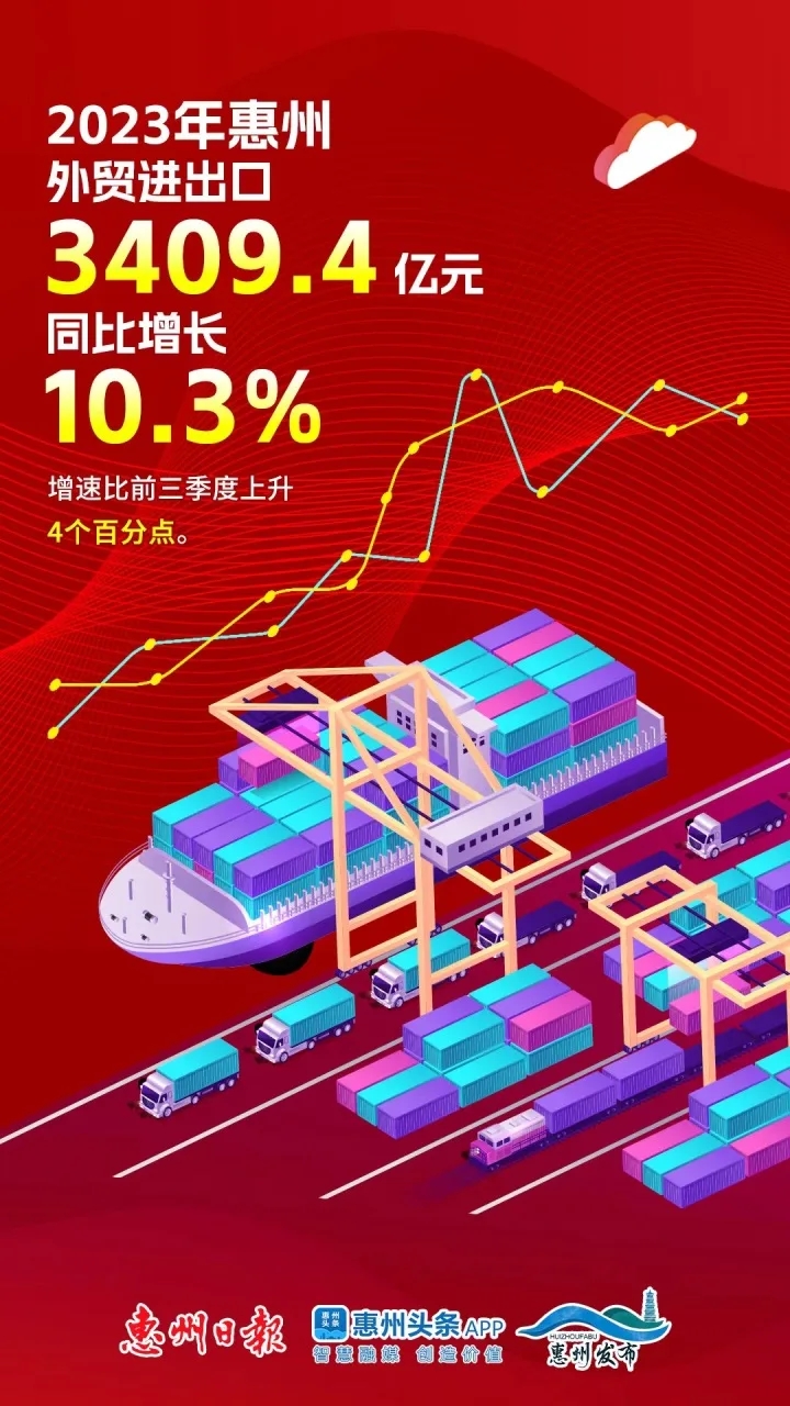 外貿(mào)方面。去年,惠州外貿(mào)進出口3409.4億元,同比增長10.3%,增速比前三季度上升4個百分點。其中,跨境電商進出口增長11%,成為新的外貿(mào)增長點。