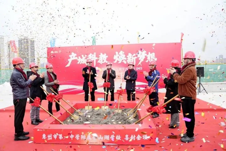2023年4月17日,惠州天安數(shù)碼城舉行了惠州一中附屬金山湖學(xué)校簽約儀式,開啟“園區(qū)、校區(qū)、社區(qū)”三區(qū)融合的全新階段;同年8月31日,學(xué)校正式奠基,以高標(biāo)準(zhǔn)、高規(guī)劃、高效率,全面啟動學(xué)校建設(shè)。時隔146天,學(xué)校建設(shè)再迎新進展,主體大樓正式封頂。